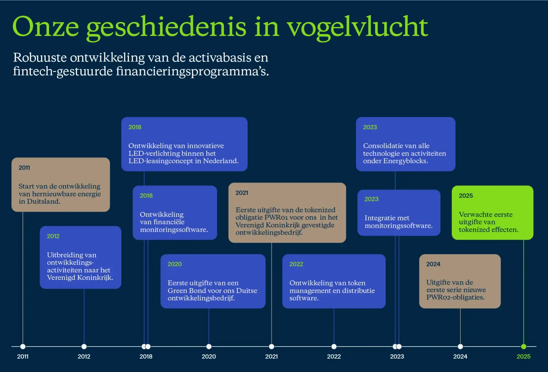 Wij zijn uiteraard niet zomaar op dit punt gekomen, Energyblocks heeft een lang track record op het gebied van duurzame energie. In 2011 ontwikkelde Energyblocks (destijds Catena Investments) al duurzame energie projecten in Duitsland en in 2012 het eerste project in het Verenigd Koninkrijk. In de jaren die daarop volgden groeide onze portefeuille en in 2021 lanceerde Catena Investments haar eerste bond-programma onder de naam Catena Power. In 2023 zijn alle activiteiten geïntegreerd onder de naam Energyblocks.